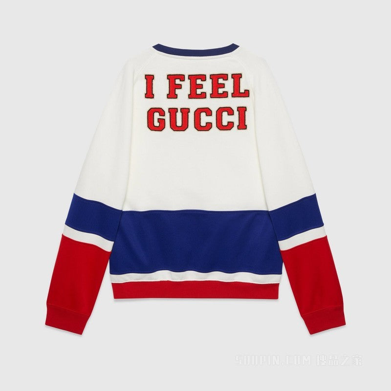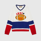 Retro-inspired Gucci wool sweater featuring a bold football graphic and “1921” embroidery. Designed with a V-neckline, color-block panels in red, blue, and white, and a relaxed fit for a sporty-luxe look.