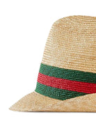 This beige Fedora hat by Gucci features a woven raffia design with the brand’s signature Web detail, offering a stylish and lightweight accessory perfect for sunny days.