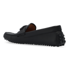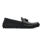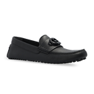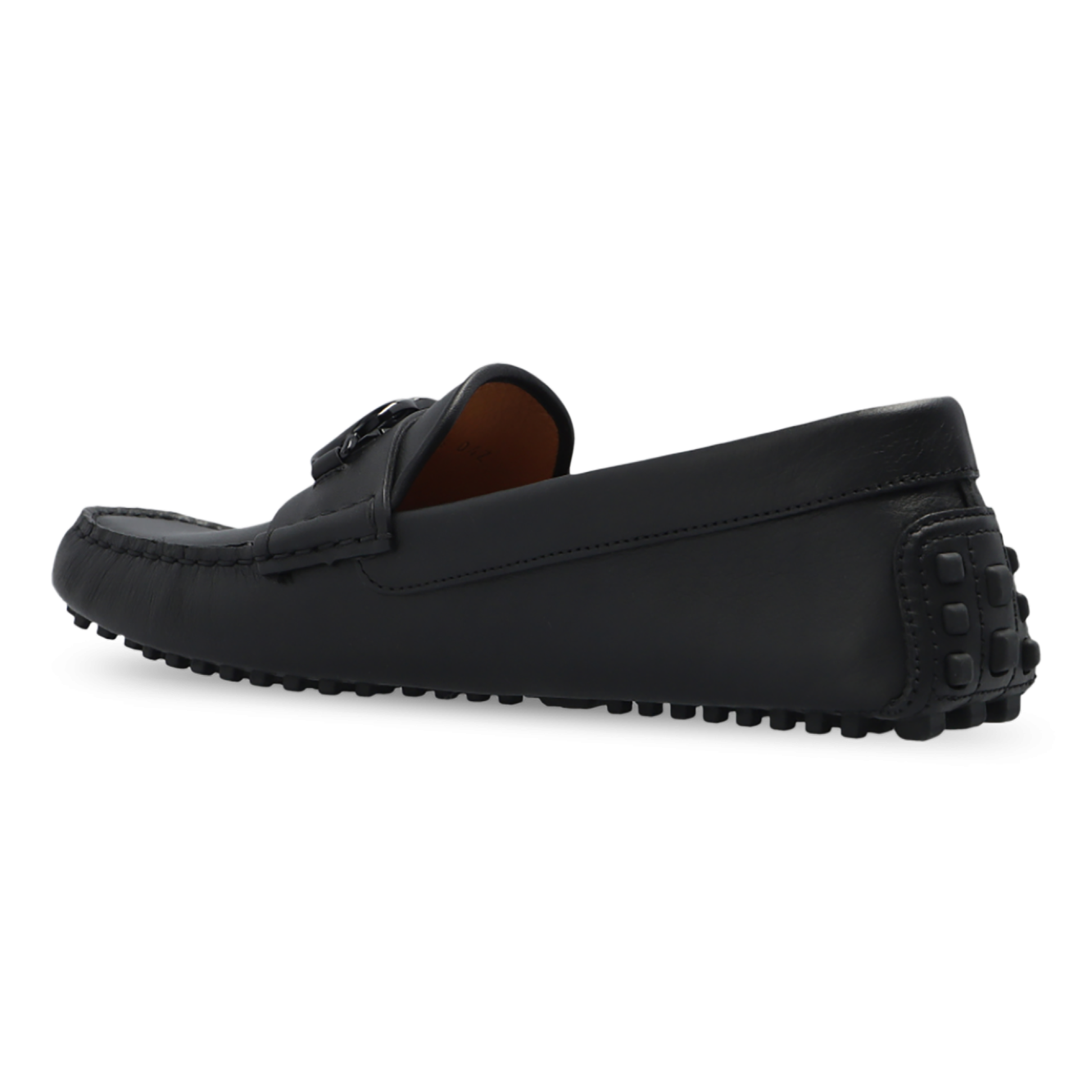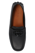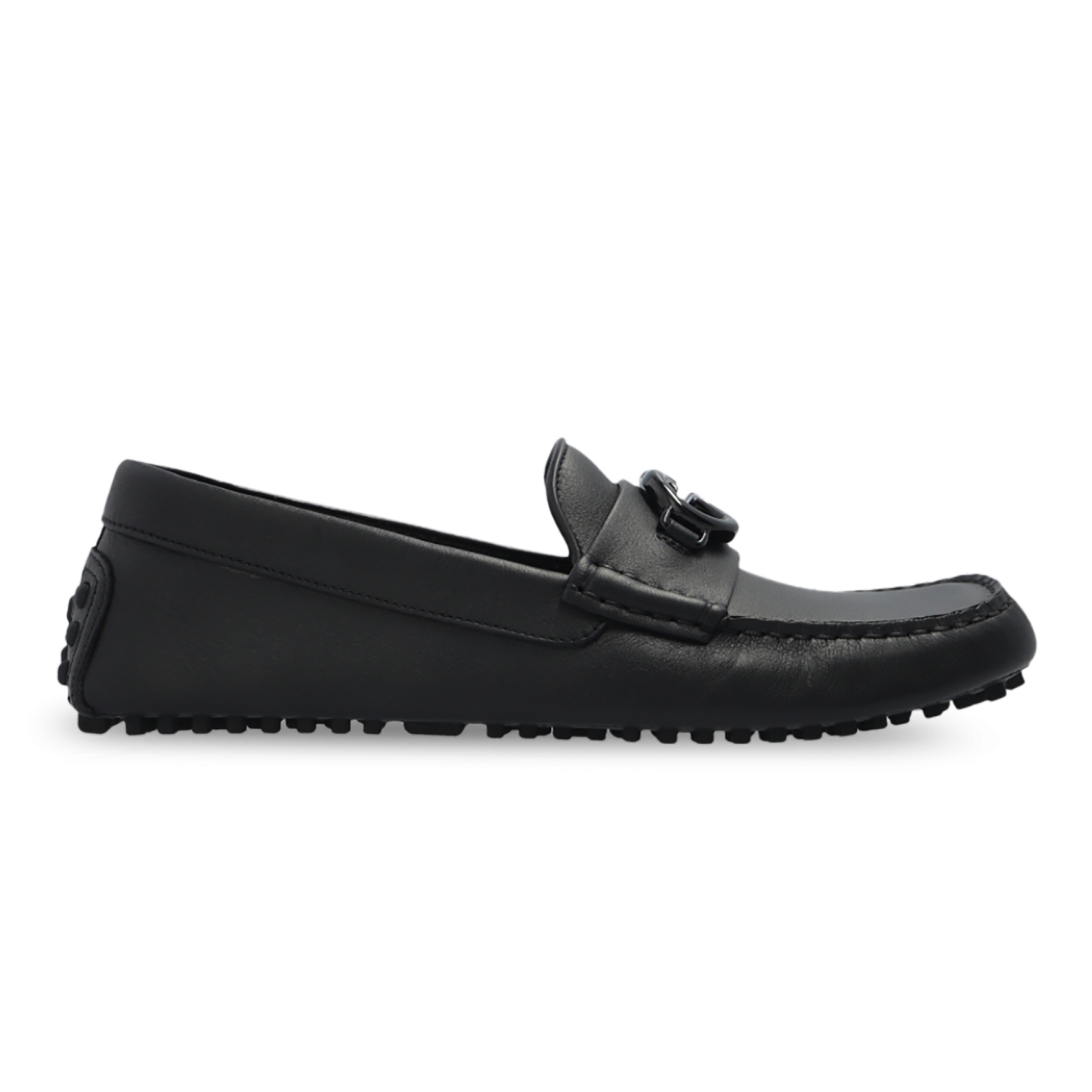 Classic Gucci leather driving loafers in black featuring the signature interlocking G detail and pebbled rubber sole. Crafted from supple leather for a refined yet comfortable finish, perfect for effortless everyday style. Fits slightly large — we recommend selecting one size down if between sizes.