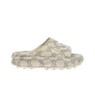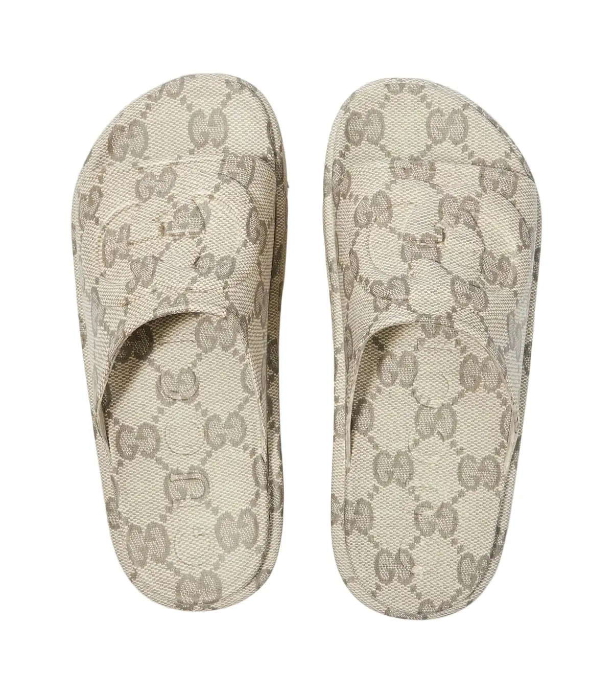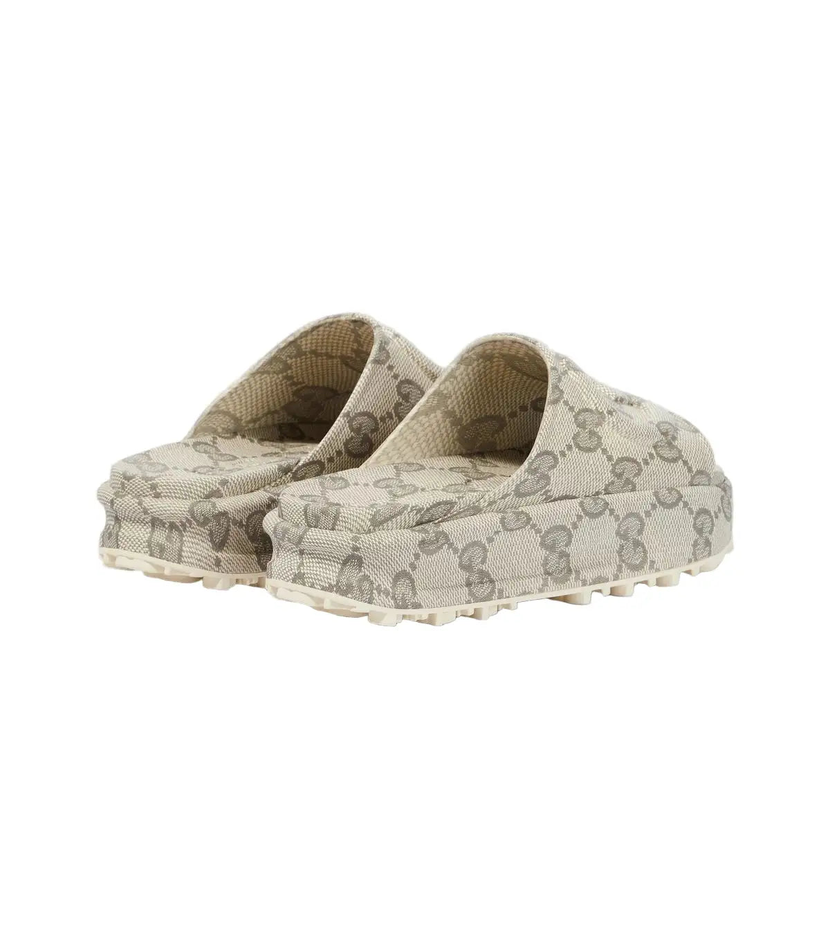 Gucci platform slides in beige GG monogram canvas with chunky sole and cushioned footbed for comfort. Lightweight rubber outsole offers durability and grip, perfect for all-day wear.