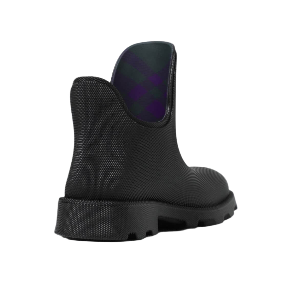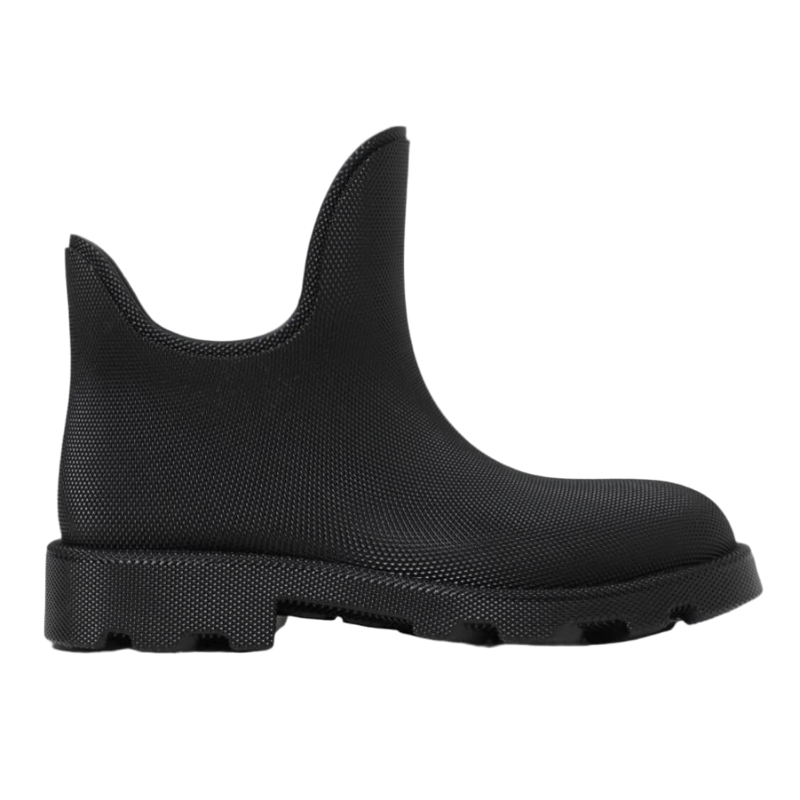 Crafted in Italy by Burberry, these black ankle rain boots combine style and function. Made from 100% polyurethane rubber, they feature a round toe and sturdy tank sole for durability in all weather conditions.
