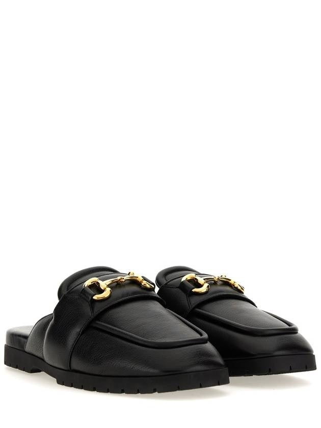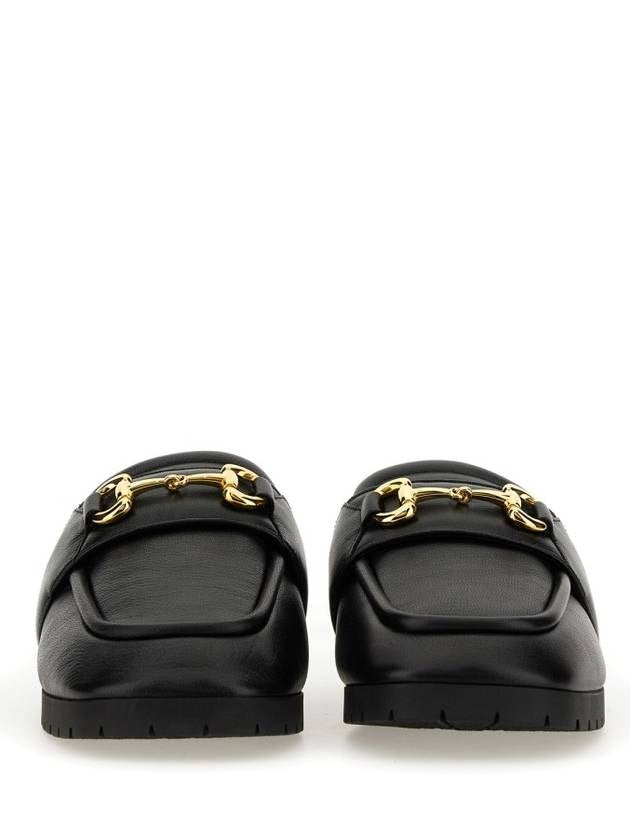 Estas sandalias de cuero negro de Gucci cuentan con una punta cuadrada, una suela de goma negra y el icónico detalle de caballo en tono dorado para una apariencia elegante y atemporal.