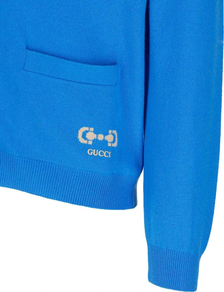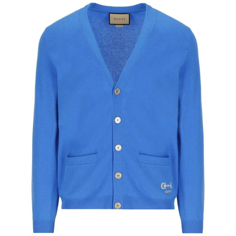 Un cárdigan de lana azul vibrante con un cuello en V clásico, cierre con botones en la parte delantera, ribetes acanalados y un sutil detalle de logotipo bordado, que ofrece un aspecto lujoso, refinado pero informal.