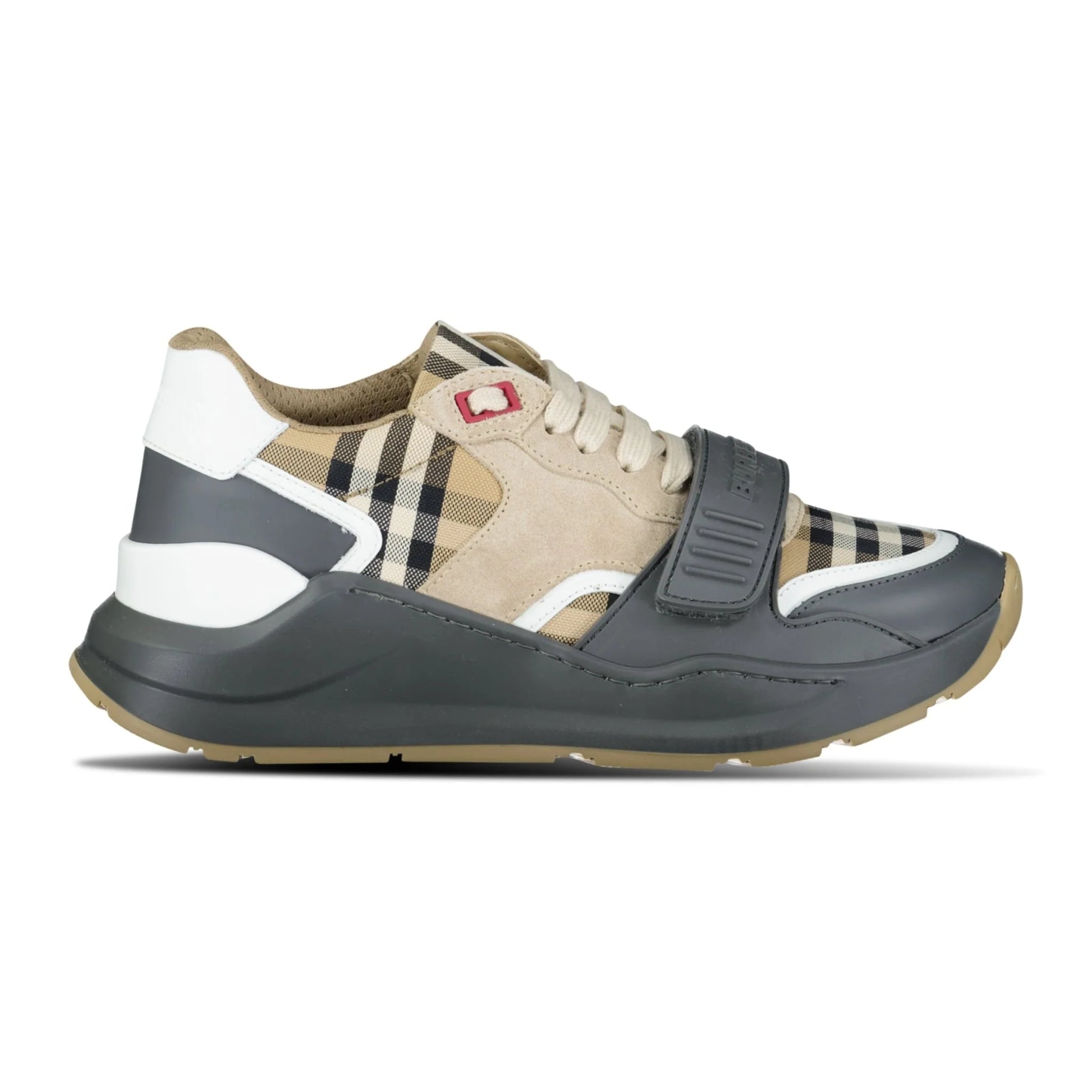 Zapatillas Burberry Ramsey con el icónico Vintage Check, paneles de ante y una llamativa correa de goma. Una silueta moderna y acolchada que combina un diseño clásico con la comodidad del día a día y un toque urbano.