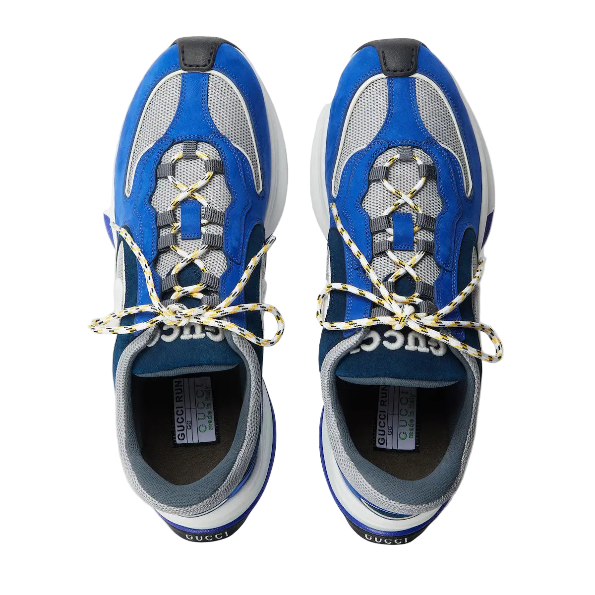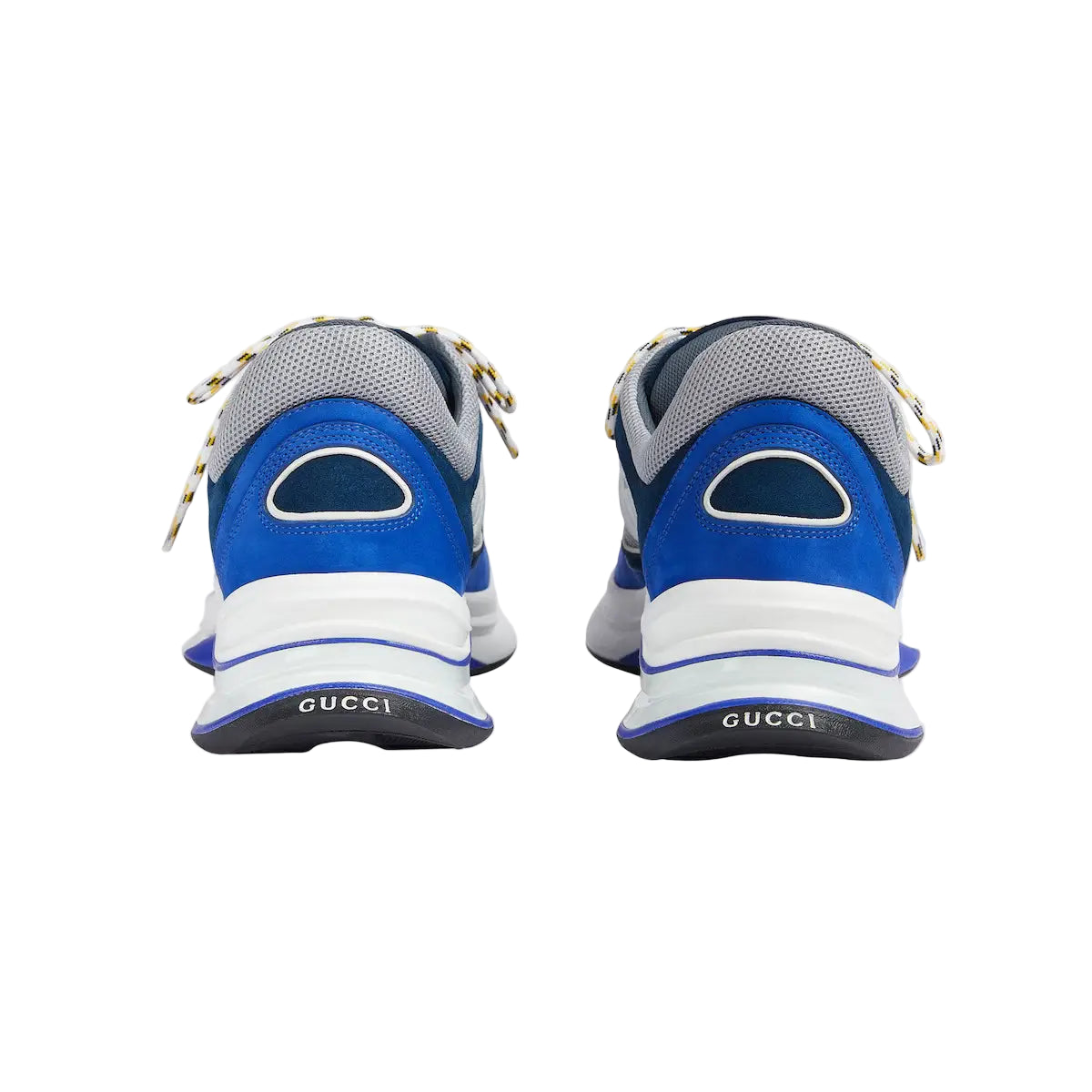 Zapatillas bajas de ante y malla azul rey con detalles grises. Presentan el logo de Gucci en el lateral, cordones en contraste amarillo y negro, cuello acolchado y suela gruesa de goma en blanco y azul.