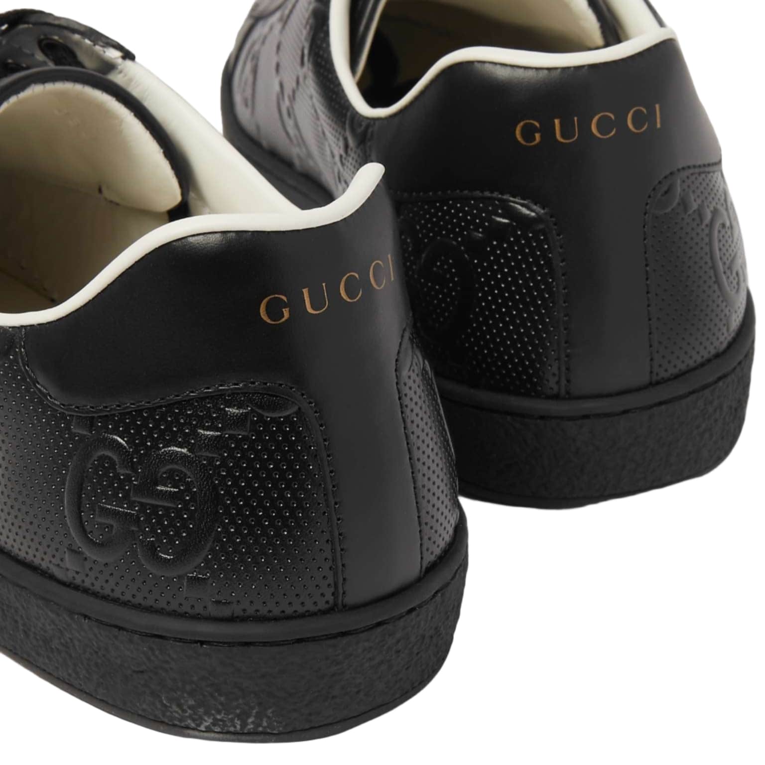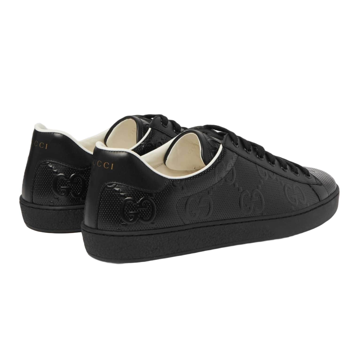 The Gucci Ace 'GG Embossed - Black' sneakers feature premium black leather with the brand’s signature embossed GG design. They offer durable craftsmanship and comfortable wear, perfect for a refined, stylish look.