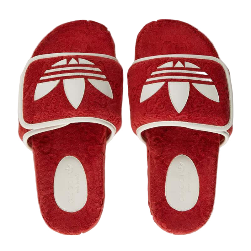 Adidas x Gucci Monogram Slide Red (Women's). These trendy slides feature a bold red color and the iconic Gucci monogram pattern, perfect for adding a touch of luxury to your everyday look. With the comfort of adidas' cushioned footbed, these slides are both fashionable and practical.