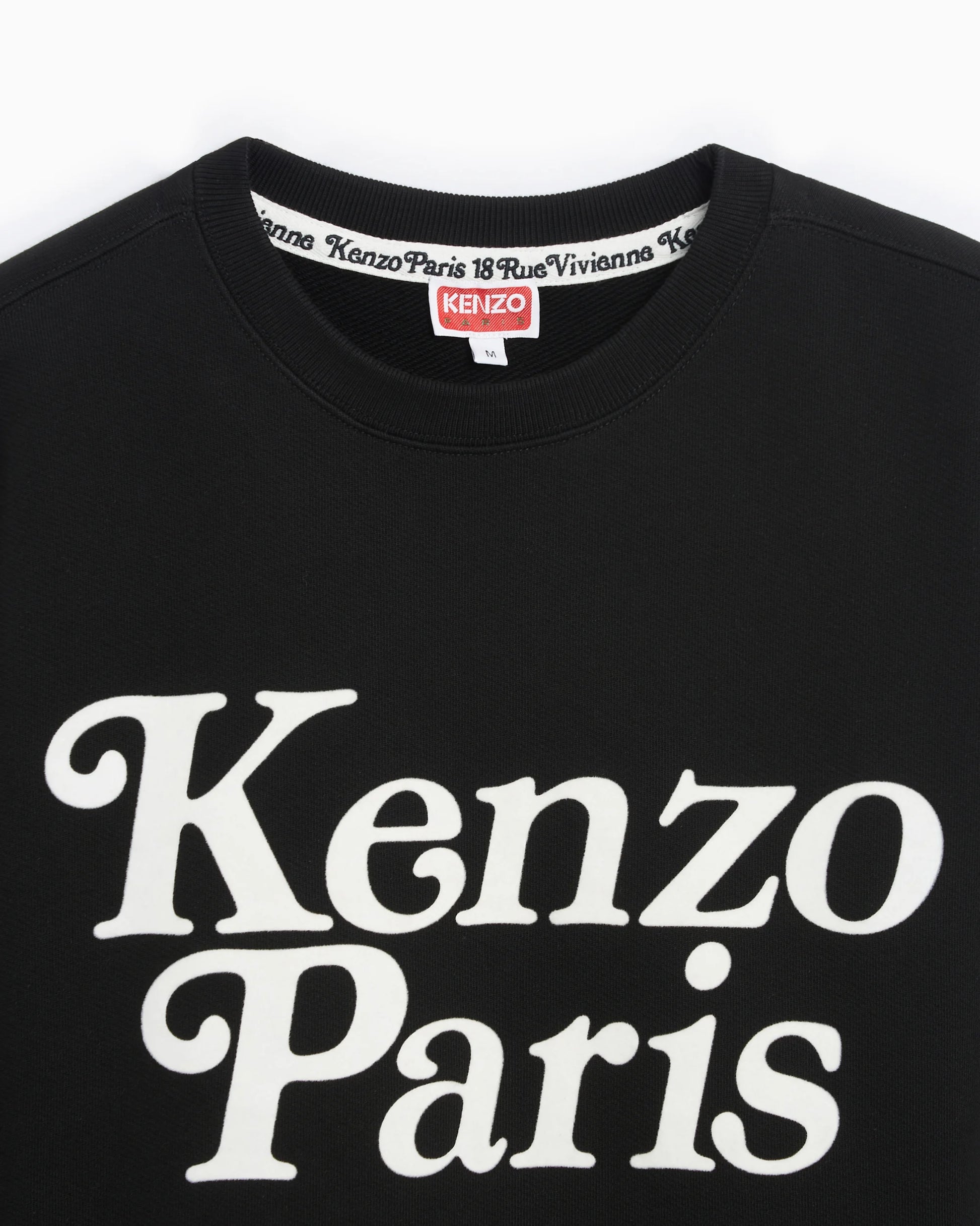 Black cotton sweatshirt featuring a bold white “Kenzo Paris” logo print on the front. Crew neck, long sleeves, and ribbed trims for a comfortable fit. 100% cotton.