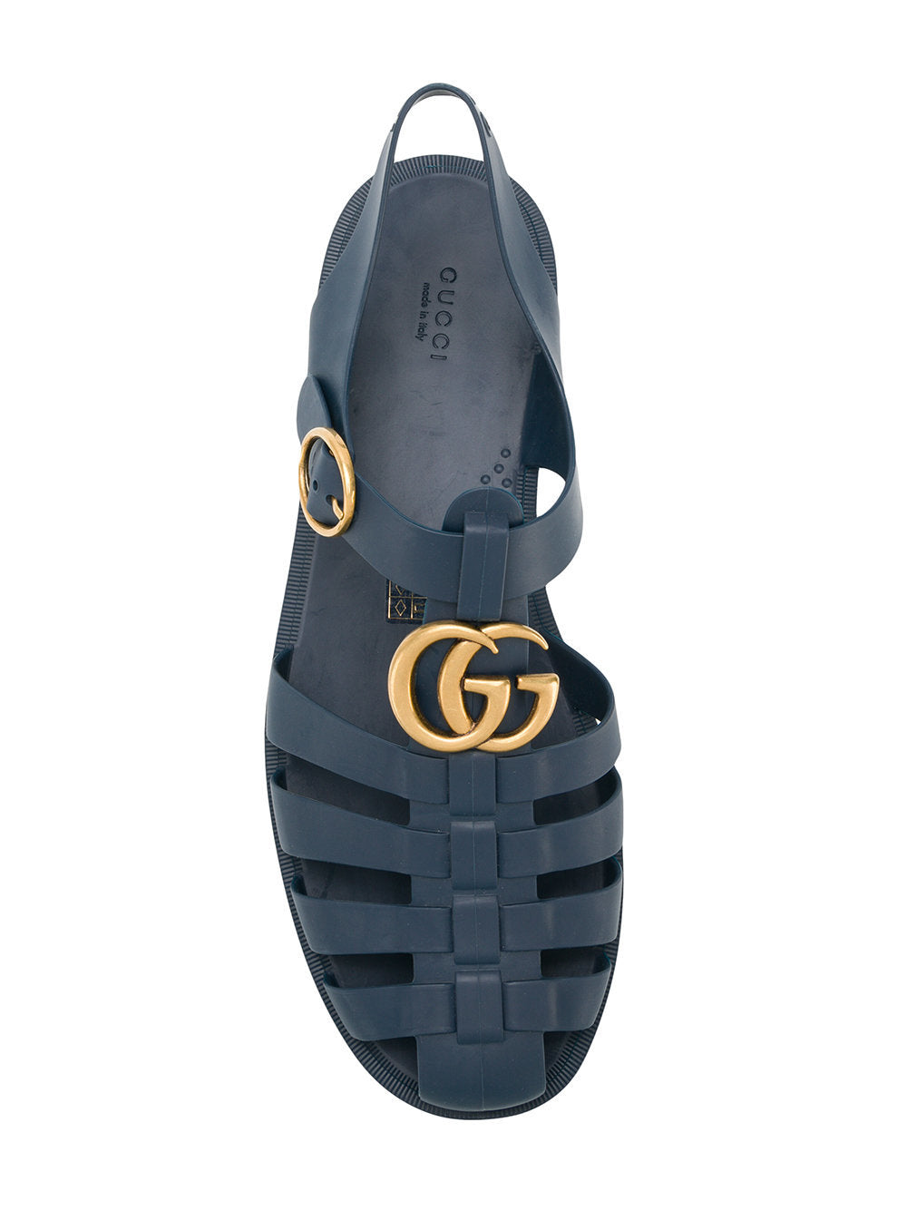 This men's rubber strap sandal features Double G hardware on one shoe and a metal feline head on the other, blending bold details with casual comfort.