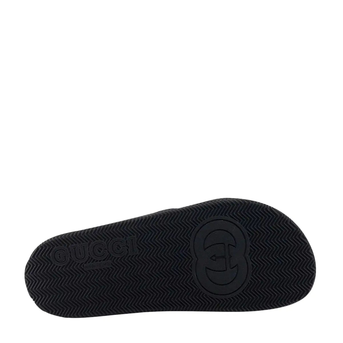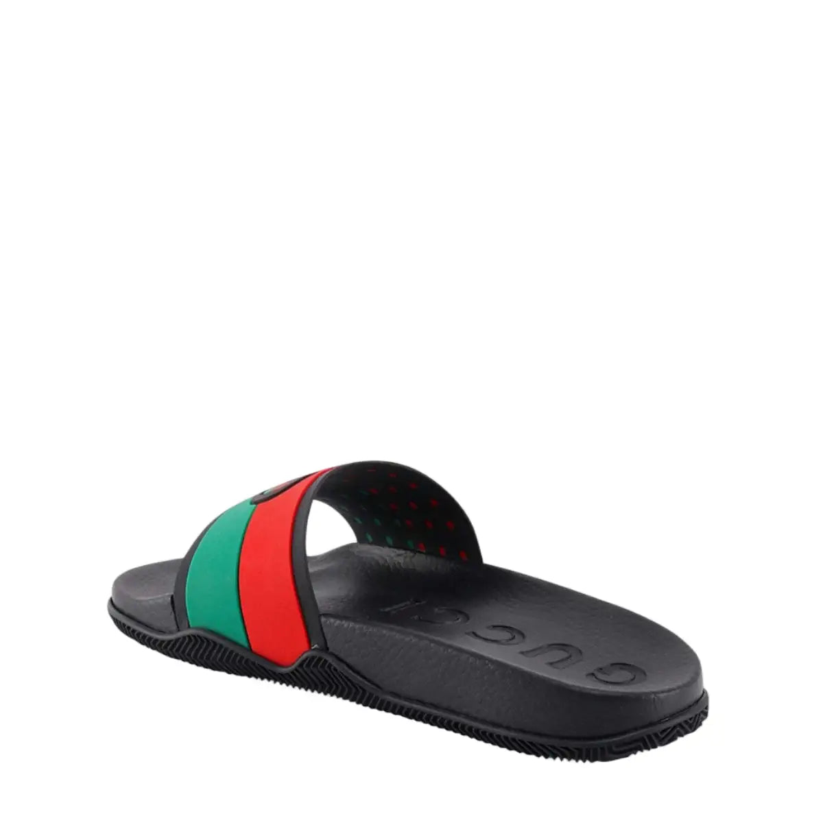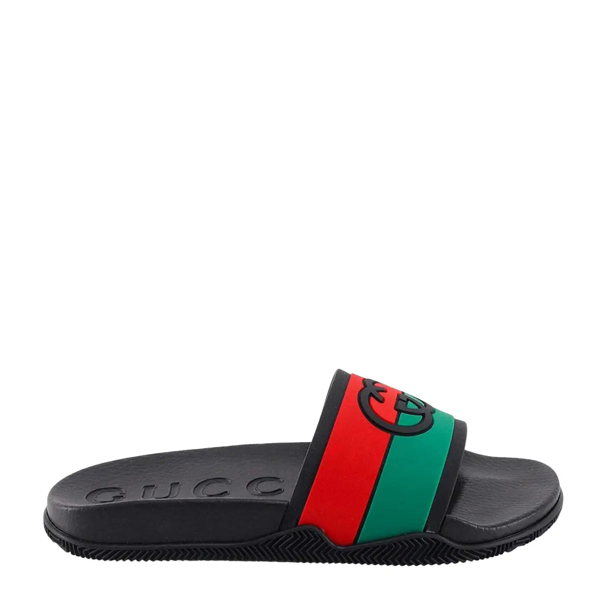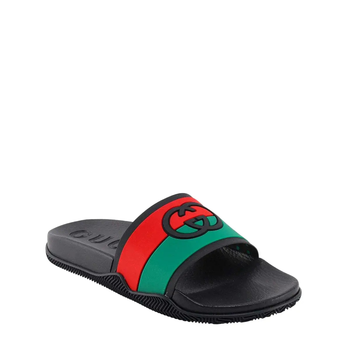 Expertly crafted in Italy, these Slide 'Interlocking G - Orange Green' sandals feature a comfortable rubber sole and iconic Web Band with an engraved GG logo. These rubber sandals are perfect for casual wear and add a touch of high fashion to any outfit. Made with durable materials, these sandals are both stylish and practical.
